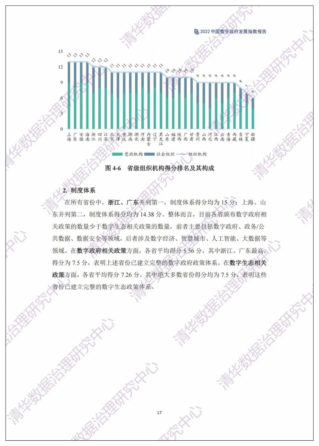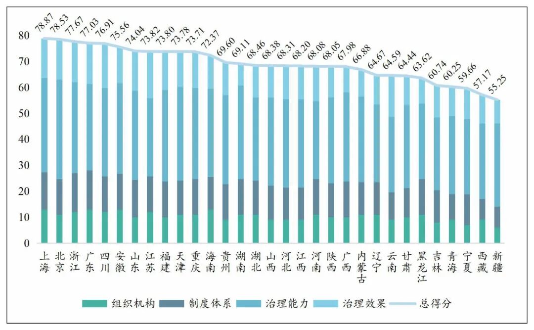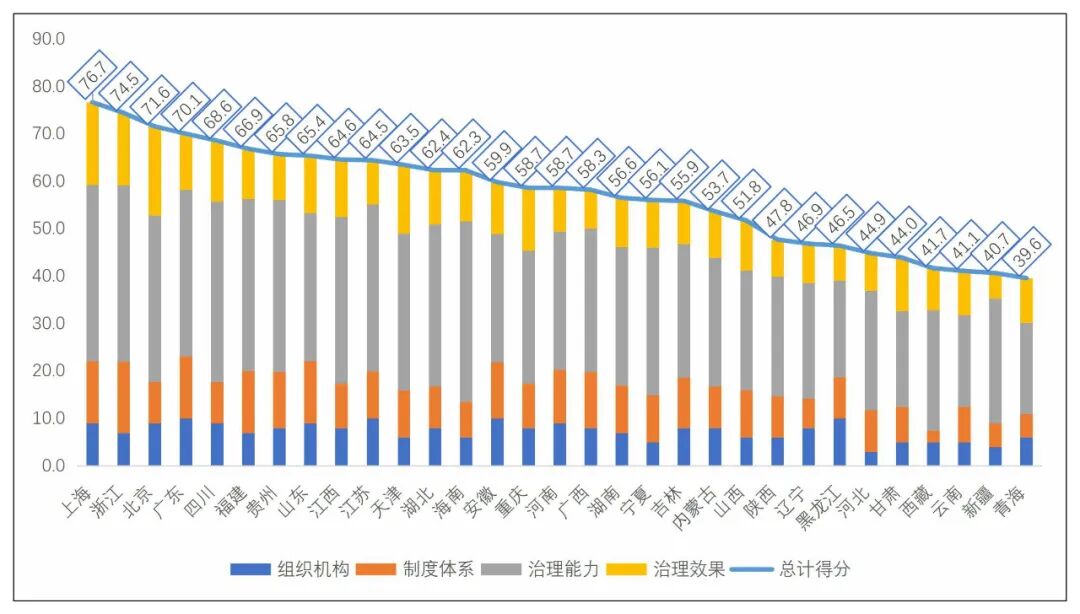 1、总得分方面。在省级层面,根据组织机构、制度体系、治理能力、治理效果四个指标的总得分测算,上海总得分位列全国第一,北京、浙江分列第二三名。