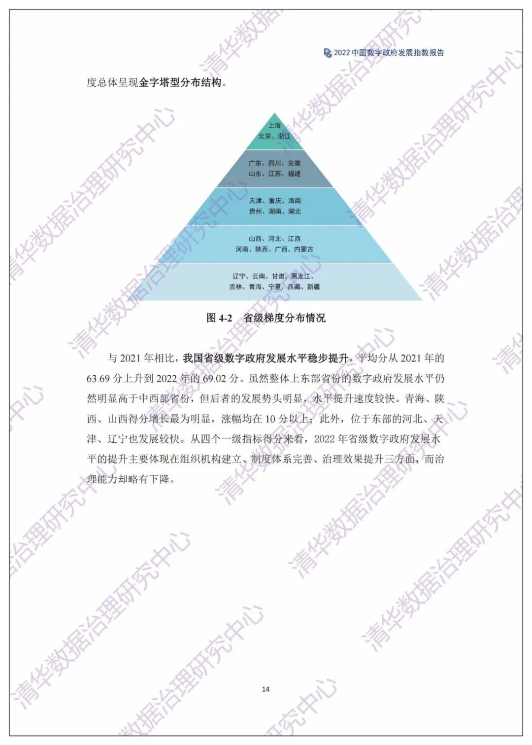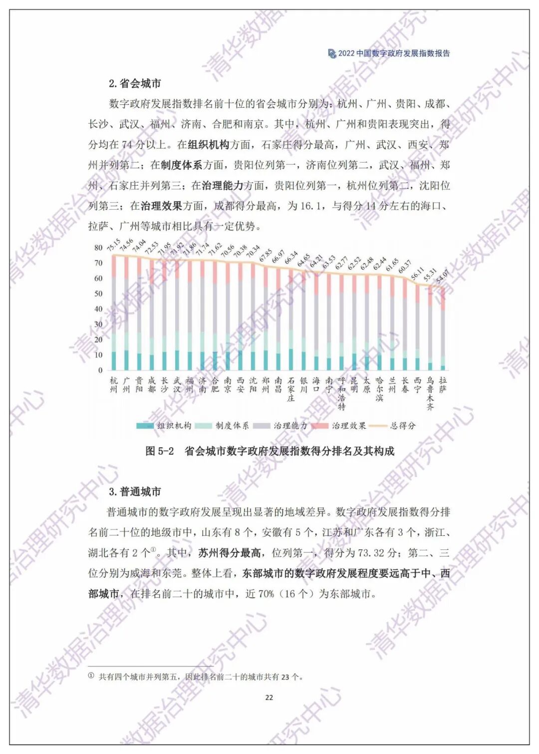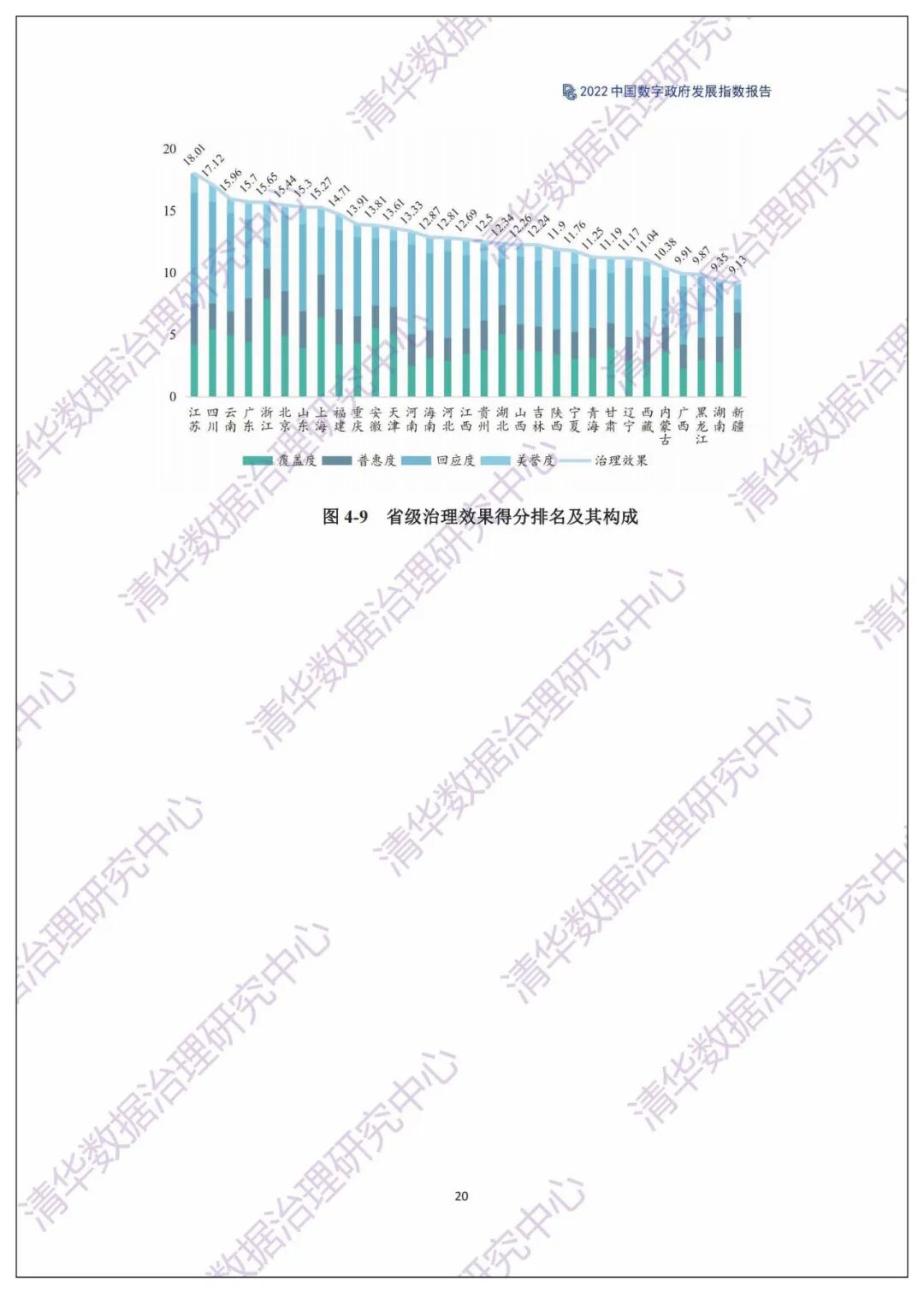 在此背景下,清华大学数据治理研究中心近日发布了《2022中国数字政府发展指数报告》,该的评估对象全面覆盖31个省、333个地级市,综合评估了囊括电子政务、“互联网+”、智慧城市、数字政府、数字经济等政府数字化转型不同发展阶段的组织机构、制度体系、治理能力和治理效果情况。
