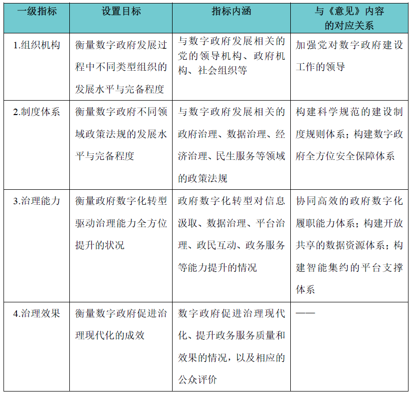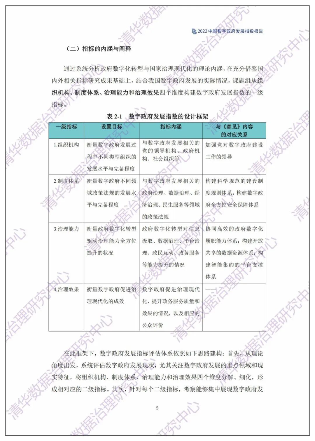 6、数字政府发展指数的设计框架。报告课程组从组织机构、制度体系、治理能力和治理效果四个维度构建数字政府发展指数的一级指标。